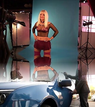 Hollie Stevens in polka-dot dress gets ravaged on the retro car spandex hood