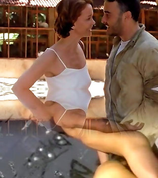 Retro intercourse by the pool with a couple