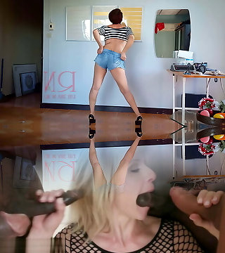 Regina Noir in denim shorts. Home striptease. Housewife flashes her pussy. The depraved stepmother unclothes. boobs and
